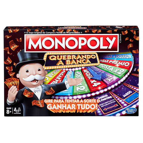 APOSTE ALTO PARA TENTAR QUEBRAR A BANCA! Monopoly Quebrando a Banca é um jogo de sorte! Você pode conquistar tudo ou perder tudo! Viaje pelo tabuleiro comprando propriedades, recebendo seu aluguel e girando a roleta da Sorte para cair em LEVA TUDO e faturar alto! Mas cuidado, você também pode se dar mal! Quanto você esta disposto a arriscar para vencer? Quando acabar o dinheiro do banco, o jogador mais rico vence o jogo!