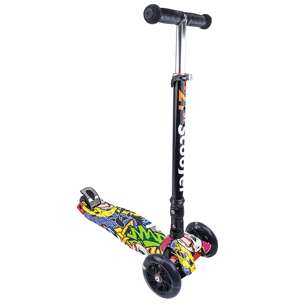Incrível Patinete que as rodas brilham ao girar, com um shape irado grafitado e guidão dobráve